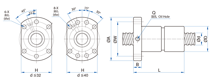 I : 導程, Da : 珠徑, n : 珠卷數, Ca : 動額定負荷(kgf), Coa : 靜額定負荷(kgf), K : 鋼性(kgf/μm) ★ : 可制作左螺紋
