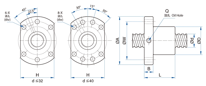 I : 導程, Da : 珠徑, n : 珠卷數, Ca : 動額定負荷(kgf), Coa : 靜額定負荷(kgf), K : 鋼性(kgf/μm) : 可制作左螺紋