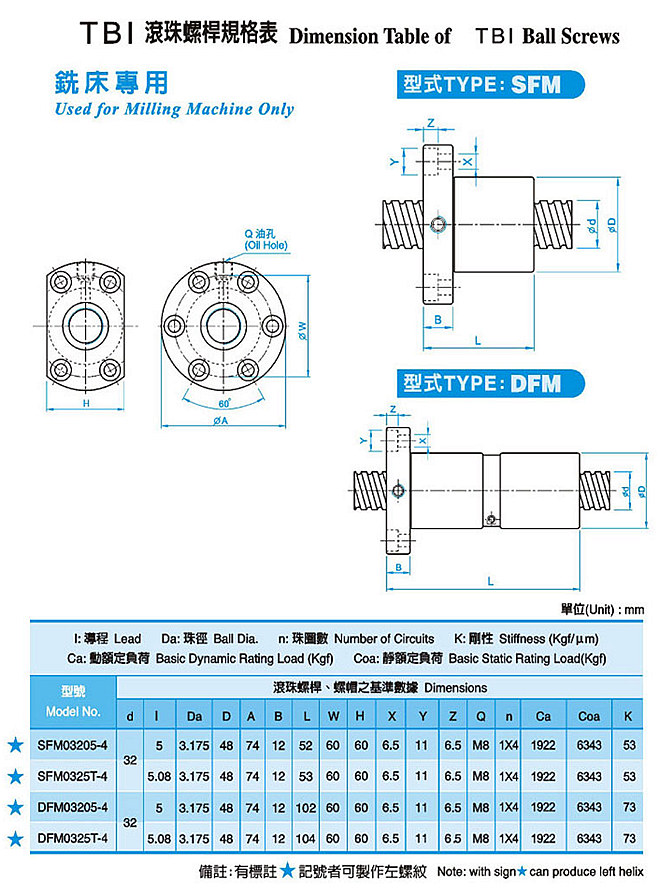 TBI滾珠絲桿SFM/DFM系列為機床專用絲桿,詳細(xì)參數(shù)如下: