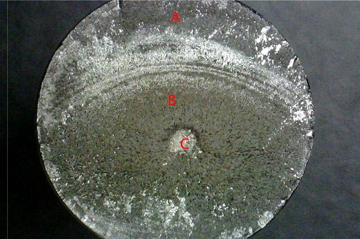 運(yùn)轉(zhuǎn)時(shí)滾珠絲桿軸端反覆受到彎曲的力量,使得初始裂紋自A→B→C最終斷裂。