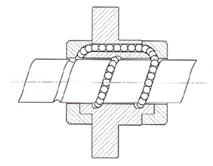 T型螺帽 此種型式是由鋼珠滾動于絲桿和螺帽之間的溝槽而前進,再被外循環管前端撈起,通過循環管路徑回流至循環管另一端,再回到原點的循環方式。一般為多卷鋼珠一次循環,外型可采用圓周型和管突出型。 |