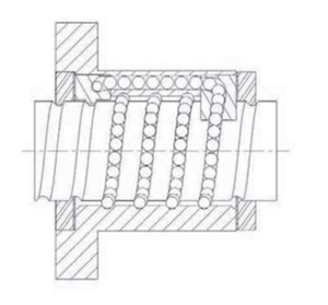 E型螺帽 此種型式的螺帽兼具了外循環和內循環的特點,在鋼珠滾動于絲桿和螺帽之間的溝槽而前進,在螺帽的尾端安裝有端蓋循環器,它可以引導鋼珠回流到螺帽本體的回流孔中,一般與外循環相同為多卷鋼珠一次循環,只是少了外循環管。 |