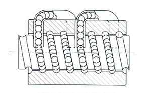 U、I型螺帽 此種型式是由鋼珠沿著內循環循環器溝槽,斜斜的越過絲桿牙峰回到原點。一般為一卷鋼珠一次循環。此種型式絲桿至少要有一端完全通牙,適用于直徑較小的絲桿,一般都采用了金屬循環器。 |