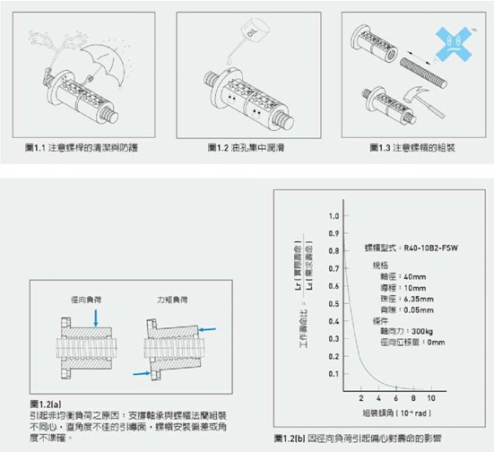 轉造級滾珠絲桿適用于精度較不高的場合,如包裝機械…等,即可選用精度 較不高的支撐軸承組合。特別重要是,避免軸承支撐座與螺帽的偏心,造成 負荷的不均,如圖1.2。不均勻負載含徑向力及扭矩,參圖1.2(a),皆可能造 成故障及壽命減低,如圖1.2(b)。