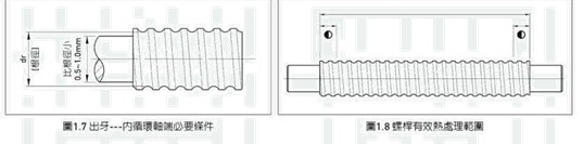 (9)滾珠絲桿熱處理時于靠近肩部加工的螺紋牙部份有10~20mm長度須保持軟 化,以便于加工肩部。此區域會標示記號于絲桿圖面上,如圖1.8。如您有 特殊之要求請與HIWIN連繫。